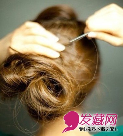 步骤五、将马尾用梳子倒刮出蓬松感,再将头发分为二分之一,扎成蓬松的花苞头造型,用发夹固定。