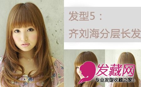 推荐理由:齐刘海风貌似在这个季节又卷土重来了,不管长发短发,直发卷发,MM们都喜欢搭上一个稚嫩的齐刘海,不仅掩龄,还能瘦脸。这款发型聪明地利用了分层的发段,先利用齐刘海遮住了额头,脸看上去就小了一半,分层的发段将人的视觉拉到头发上,脸自然就变小了。