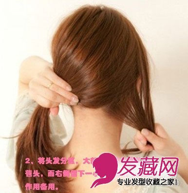 将头发分区,大部分头发作为扎花苞头,而右侧留下一小束作为修饰作用备用
