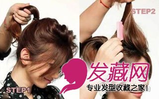 step2:盘出发型,将上不的头发抓起稍稍打毛,然后按顺时针的方向缠绕在下面的马尾辫上。
