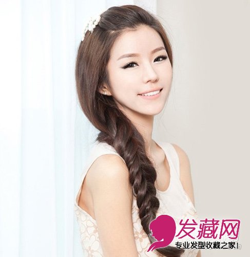 小编点评 :长长的棕色长发,扎成蓬松的麻花辫,将长长的刘海梳往脑后用蕾丝夹固定,露出光洁的额头。非常甜美的女人味再带一点复古的气息。