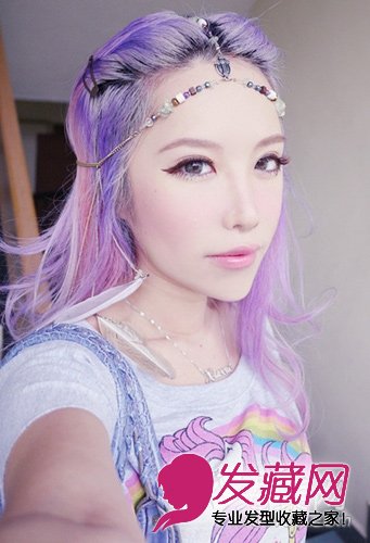 充满梦幻气息的粉紫色与粉红色染发,把长发扎起再配搭发饰,塑造出非常唯美的漫画少女形象。