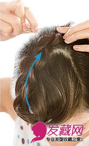 取头顶发丝往前编成一条三股辫后,转至后方用小黑夹固定于后脑勺。