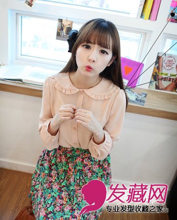 小编点评:超萌的齐刘海长发,内弯的齐刘海做出很好的弧度,发尾剪出厚重感,非常的显瘦减龄,配上侧边的一个花朵发饰,真的超级甜美