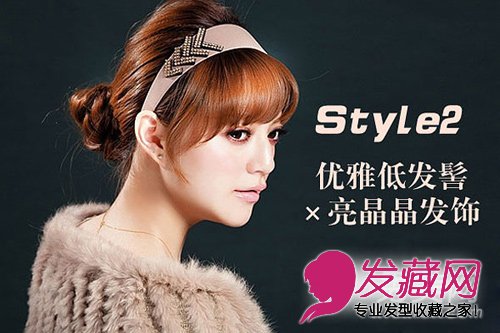 以宝石、亮片等小奢华元素来创造头发亮点,局部点缀就不怕太over,服装以深色调当道的秋冬,就要以闪亮的发饰脱颖而出!将头发收成低一点的发髻,搭配华丽感发圈,展现小女人氛围,参加PARTY或正式场合都OK!