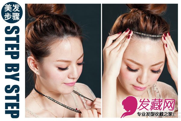 扎好蓬松的丸子头后,将发带套在脖子上,然后双手向下拉。