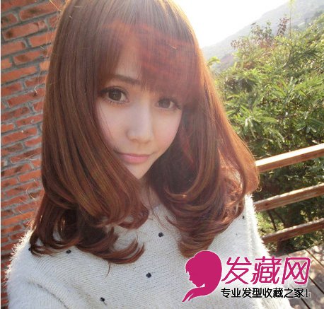 一款非常清新甜美的中长发梨花头发型。金棕色的染发颜色搭上齐刘海的梨花头发型,一定是超级甜美减龄的。发尾梨花烫的层次卷度,也是非常美丽的。