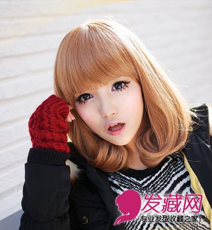 依旧是齐刘海的中长发梨花头。也是一款比较时尚的韩系发型呢!金色的染发颜色,同样是非常的耀眼。比较适合皮肤白皙的女生。