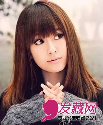 齐刘海的中长发梨花头发型。这款发型就比较贴近自然的感觉,发尾微微的卷度,打造出不一样的清纯美感。