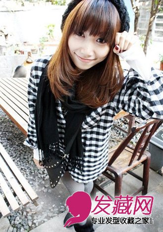 棕色系的层次齐刘海梨花头发型。配上黑色的毛线帽子,是一款很适合春季的打扮风格。自然简单却又不失时尚的感觉。