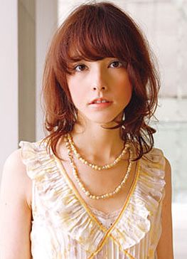 刚到锁骨的长度,显得发型女人味十足;较为轻巧的内卷发 尾和本年流行的红色系发色带出了整个发型活泼跳跃的感觉,令温婉的中长发拥有掩龄的神奇功效;蓬松的齐眉长刘海 突出表现了双眼魅力,是各位想拥有电眼的MM的最佳选择哦。