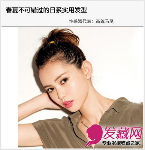 将所有头发集中于头顶处,无需留出空隙,紧紧将发丝固定于头顶束紧,头顶处的高马尾会自然起到立体蓬松的视觉拉长效果,前额和两侧均紧贴头皮集中在头顶处即可。此类打理手法会让本来清纯的马尾变得有性感味道。