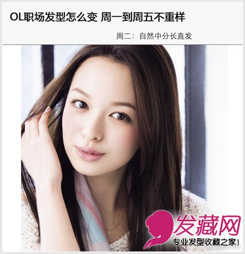周一整理上周未完成和当天的工作量,加班到深夜的你第二天往往睡过头,蓬头垢面是OL女性职场大忌,不如一切从简,梳一个简单大方的自然长直发上班,清新减龄又不会太过随便,还能够为枯燥的周二提升好心情