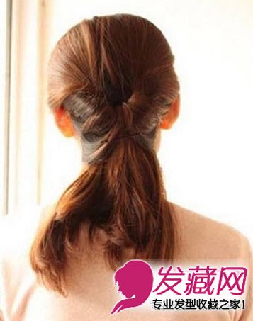 步骤四:将马尾辫翻转并穿过上部挖好的小洞,记得发尾要全部拿出来哦。