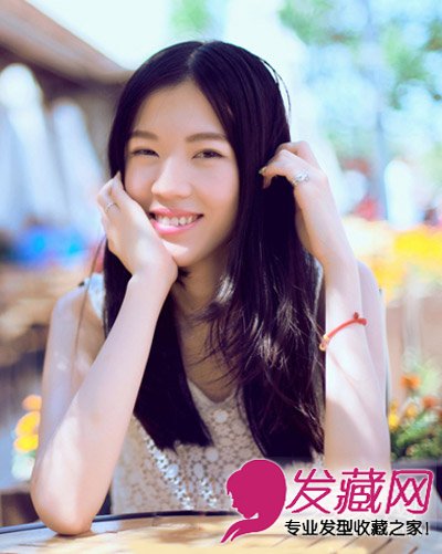 清新的中分直发发型图片,梦幻般的直发披散在胸前,深色的发丝的很有减龄效果,穿上吊带裙清新自然。