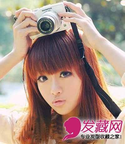乖巧的齐刘海梨花头发型,浅棕色的染发显得时尚大气。简单的白色T恤搭配,更显时尚休闲气息。