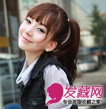 蓬松透气的齐刘海往往能起到修颜的作用,然后其余的秀发扎起一个马尾辫,放在肩部,发尾蓬松稍卷的秀发瞬间提升甜美指数。