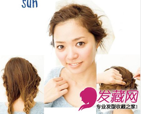 打造重点:从左右两侧的前额开始,分别编制两股麻花辫至发尾。将两股麻花辫在脑后中央位置横向交叉缠绕成蓬松盘发造型,并在两股麻花辫发尾处用发夹固定绑紧。