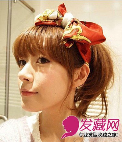 系法:将头巾从后脑下方沿着耳朵向头顶处刘海七分的样子位置系成一个蝴蝶结。注意,不需要完全地盖住刘海,而是相当于头箍功能那样系好即可。