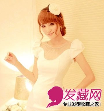 在发顶的位置点缀上了一朵白色头饰,跟洁白的裙装十分搭配,衬出了一个漂亮的宴会女生形象,斜分的刘海线条厚重而饱满,露出了女生好看的五官,低低扎起的盘发尽显妩媚之气。