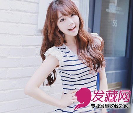 一款浪漫时尚的长发烫发发型,红棕色染发的长发发型映衬白皙肤色,时尚修颜斜刘海卷发显瘦功效极佳,棕色的染发时尚大方。