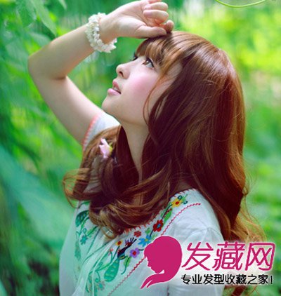 美腻的齐刘海长卷发烫发,蓬松质感的波浪发卷自然蜷曲在胸前,打造出浪漫妩媚的女性气质,搭配妆容,清新甜美。