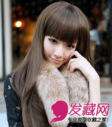 随意披散的直发发型,散发出浓郁的优雅甜美气息。厚重的齐刘海发型设计,减龄修颜的必备法宝。浅棕色染发发色衬托出女生粉嫩的肌肤。