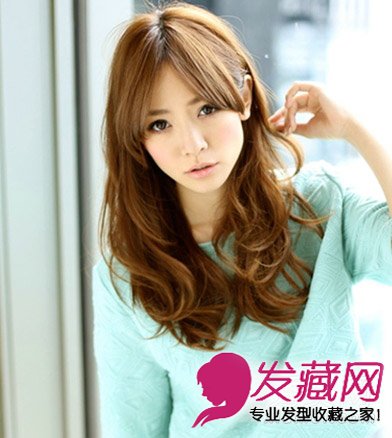 中分的刘海,长长头发散落在肩后,一份随意、自然展现,染上栗色的发,很显时尚、潮流,娃娃脸女生很适合哦!