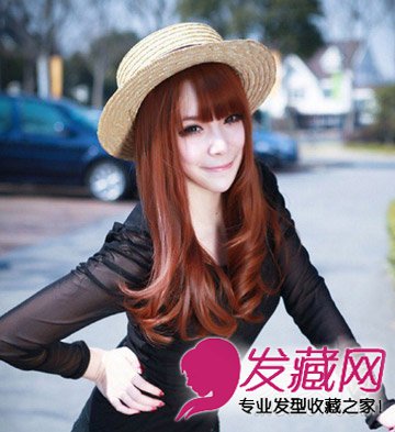 简约的中长卷发一直是职业白领丽人的时尚必备款,全新设计,棕红色奢华高贵,发尾的内卷更多了一份淡雅气质,齐刘海完美减龄,草帽打出一丝俏皮。