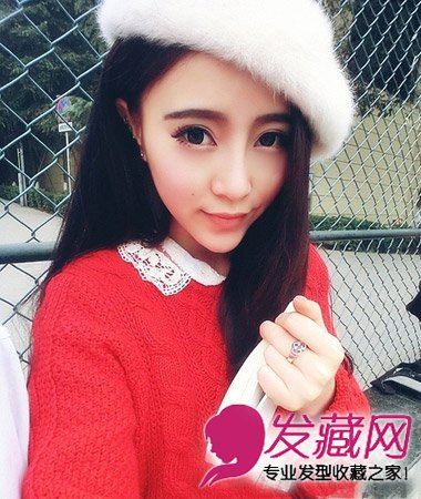 这款长直发可谓超百搭,黑长直是最经典的淑女发型,中分的长发包住脸颊最瘦脸,搭配帽子甜美可爱。