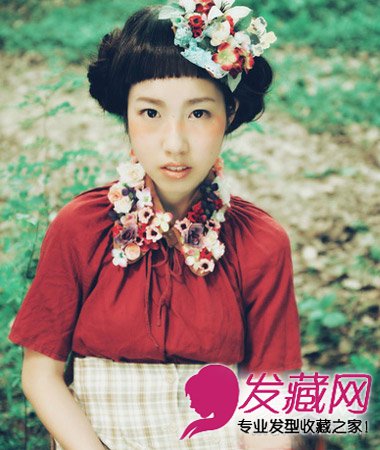 日系森女风扎发发型,这款修剪出弧度感的超短齐刘海很是考验MM们的脸型哦,搭配日系的盘发,清新森系。