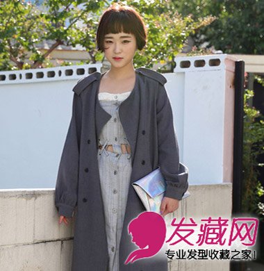 矮个子MM其实也可以尝试长款的外套造型哦,简单的韩式波波头短发干练显知性,搭配灰色系造型显高显知性。