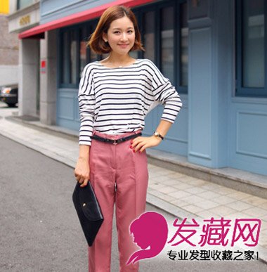 另一款提高腰线显高的时尚韩式街拍造型,粉色系长裤搭配条纹衫,搭配甜美的韩式短发,娇小干练又甜美可爱。