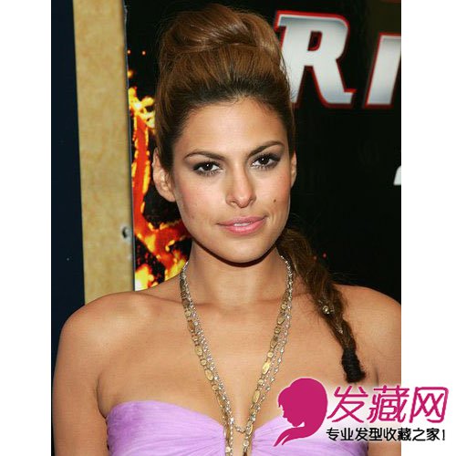 麻花辫也是很多欧美女星都很喜爱的一款发型,在发辫中加入一些简单的装饰会让整个造型立马就生动起来,比如EVA加入的金属发饰就让造型多了几分摇滚酷感。