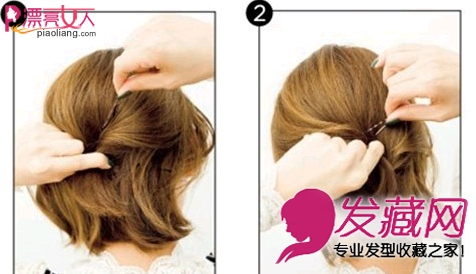 1.从耳朵两旁取两缕头发,旋转定在后脑勺,不需要过度旋转头发来显蓬松。