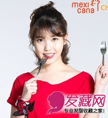 IU的这款发型适合中长发MM打理,简单的办披肩扎发清新随意,如果MM们是中长卷发扎这款发型则会让发丝更显蓬松蜷曲,很是减龄。