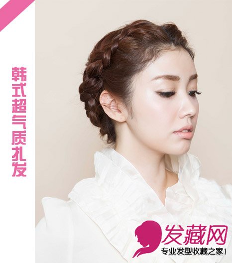 侧面效果:取出前额的刘海沿着头型编成一圈饱满的辫子,打造出如花环般的甜美感。