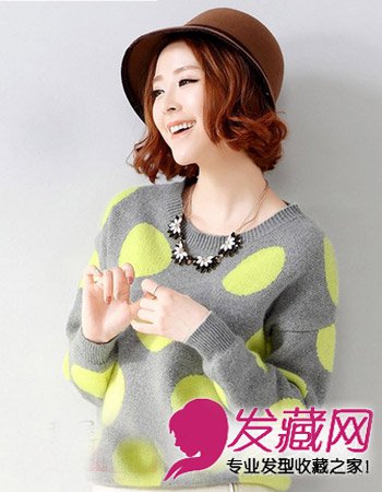 韩式个性的烫发发型,发尾做出梨花烫的发型,一款气质的齐肩中分发型在帽子拗出的造型下面衬出一种时尚感,颇有气质。