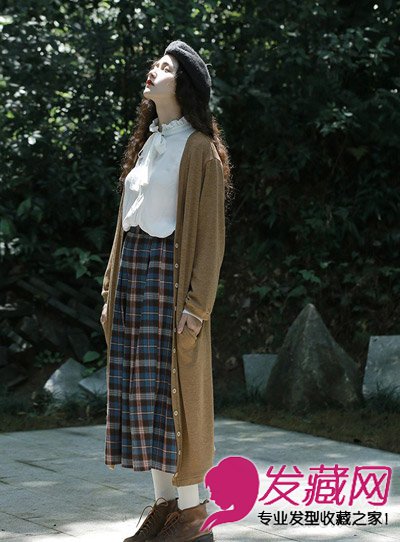 个性的长卷发发型,泡面头一样的厚重卷发让女生看起来像个洋娃娃,日系的长版针织纱,小礼帽,白色的衬衫很显清纯,很学院风的一款造型。