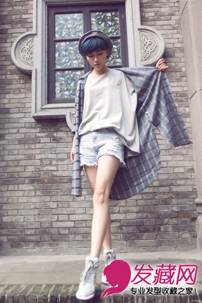个性的短发蘑菇头发型,再加一点点蓝色的挑染更显潮流气息,各自的外套搭配帽子,也是初秋很适合的一款造型。