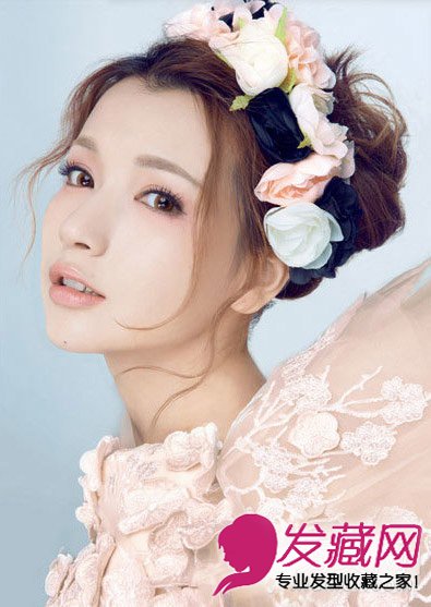 发型点评:高耸的盘发稍显凌乱,中分长刘海烫出轻盈的弧度,修饰脸型之余展现出女人味。大朵的花朵穿插在发间,变身花朵女神。
