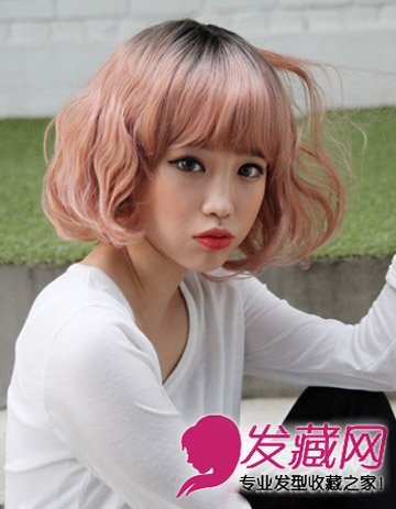 甜美的韩式蛋卷头形成蓬松的蜷曲。而且时尚的粉色系染发更显个性与甜美一些,短发呈现的波浪感更凸显出气质感,甜美十分。