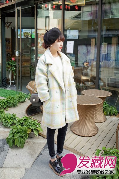 宽松板型的阔型大衣在今年可是很火爆,凸显女生甜美气质,搭配帽子更是可爱无敌,浅色的外套,修颜的空气刘海,露出帽子的一点小马尾,整体很是年轻俏皮。