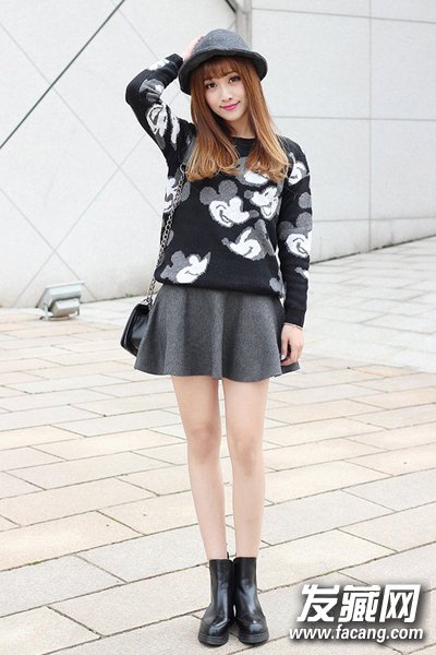 齐刘海长发发型也是必不可少的,齐眉的平刘海,棕黄色的染发,发尾的烫卷发增添了时尚度,卫衣加短裙显高又养眼。