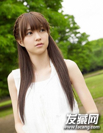 再是一款清新淑女范十足的女生长直发扎发发型,这种及腰式的长直发发型可是好多女生的梦想哦,而配合迷种辫子式的半扎发造型与清新自然的咖啡色染发相搭更显时尚风,齐刘海与长发公主头的扎发发型更显名媛淑女风。