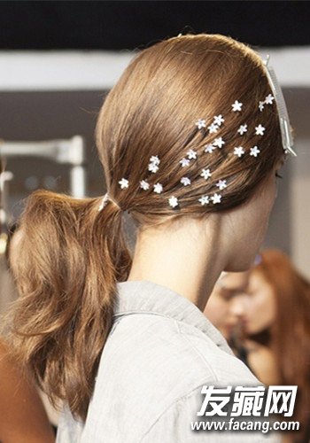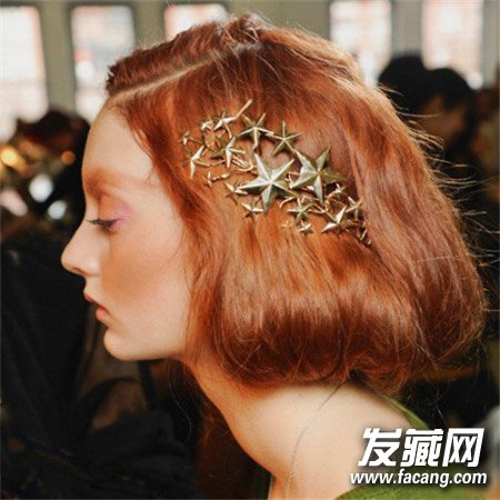 五角星的发饰,从多渐变到少,隐入发丝中间,再搭配上偏红的发系,有种美人鱼的感觉,使这款中长发更添些许灵气,这就是发饰的魅力。
