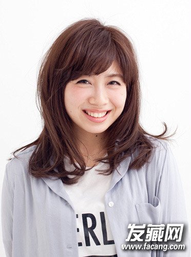 发型点评:栗色中长发甜美个性,侧分斜刘海修饰额头,圆润的发束拉伸脸部线条,凸显出甜美可爱的感觉。