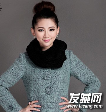 一款优雅高贵感的女生大衣造型设计,这种简单的将长发进行高耸的丸子头扎发设计,再与清新的无刘海造型相搭,而微显青色的大衣造型更显高贵温暖风。
