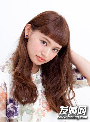 发型点评:这款发型颇具东洋风,齐刘海清爽自然,整齐的扣在额头上,露出半截额头展现出清爽气质。厚重的大波浪长卷发绚丽迷人。