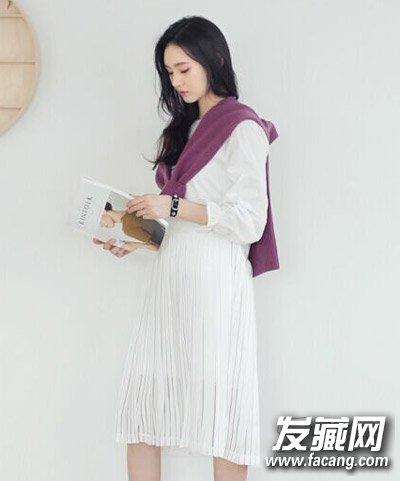 一款很显气质的披肩发发型,白色连衣裙加淡紫色毛衣,瞬间变身文艺女神,清新治愈。